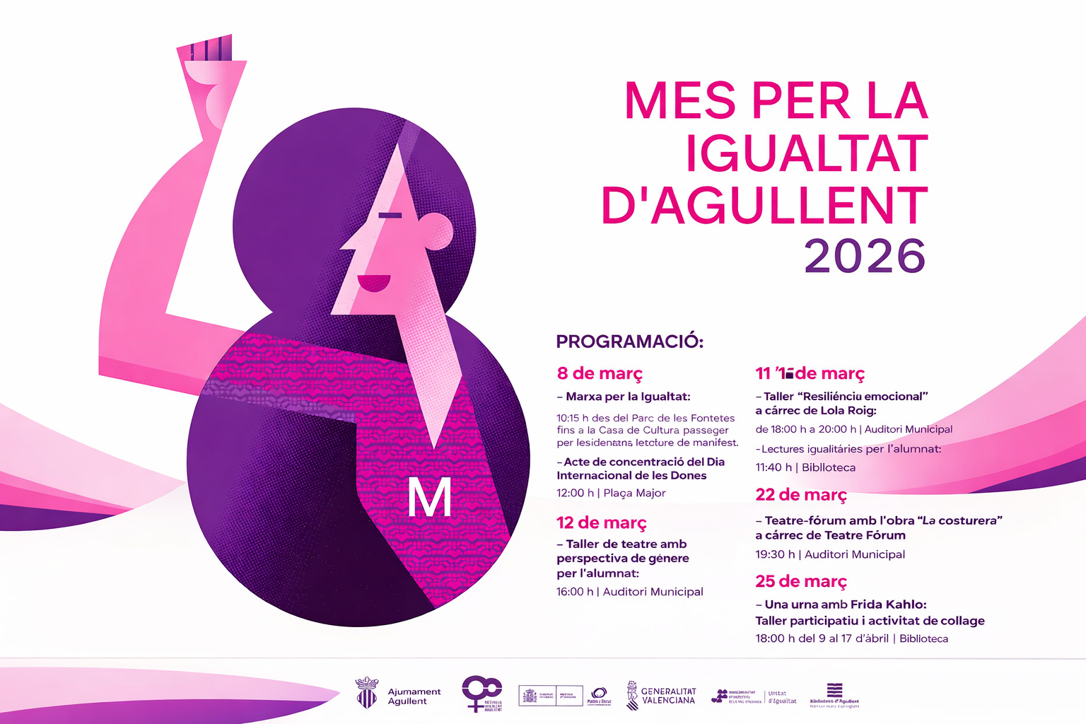 La concejalía de Igualdad del Ayuntamiento de Agullent ha dado a conocer la imagen del Mes por la Igualdad y el conjunto de actividades organizadas con motivo del 8 de marzo, Día Internacional de las Mujeres. Este año, la propuesta trabaja la igualdad y la mirada feminista desde diferentes ámbitos y se dirige a públicos diversos. La programación comenzará el mismo domingo 8 de marzo con la Marcha por la Igualdad, con inscripción previa en la Casa de la Cultura. La salida será a las 9:00 h desde la Font Jordana, donde todos los participantes recibirán un obsequio, y el recorrido, de unos 3 kilómetros por el término y la sierra de Agullent con parada para desayunar, finalizará en la Plaza Mayor, donde a las 12:00 h tendrá lugar el acto de concentración y lectura del manifiesto del Día Internacional de las Mujeres.