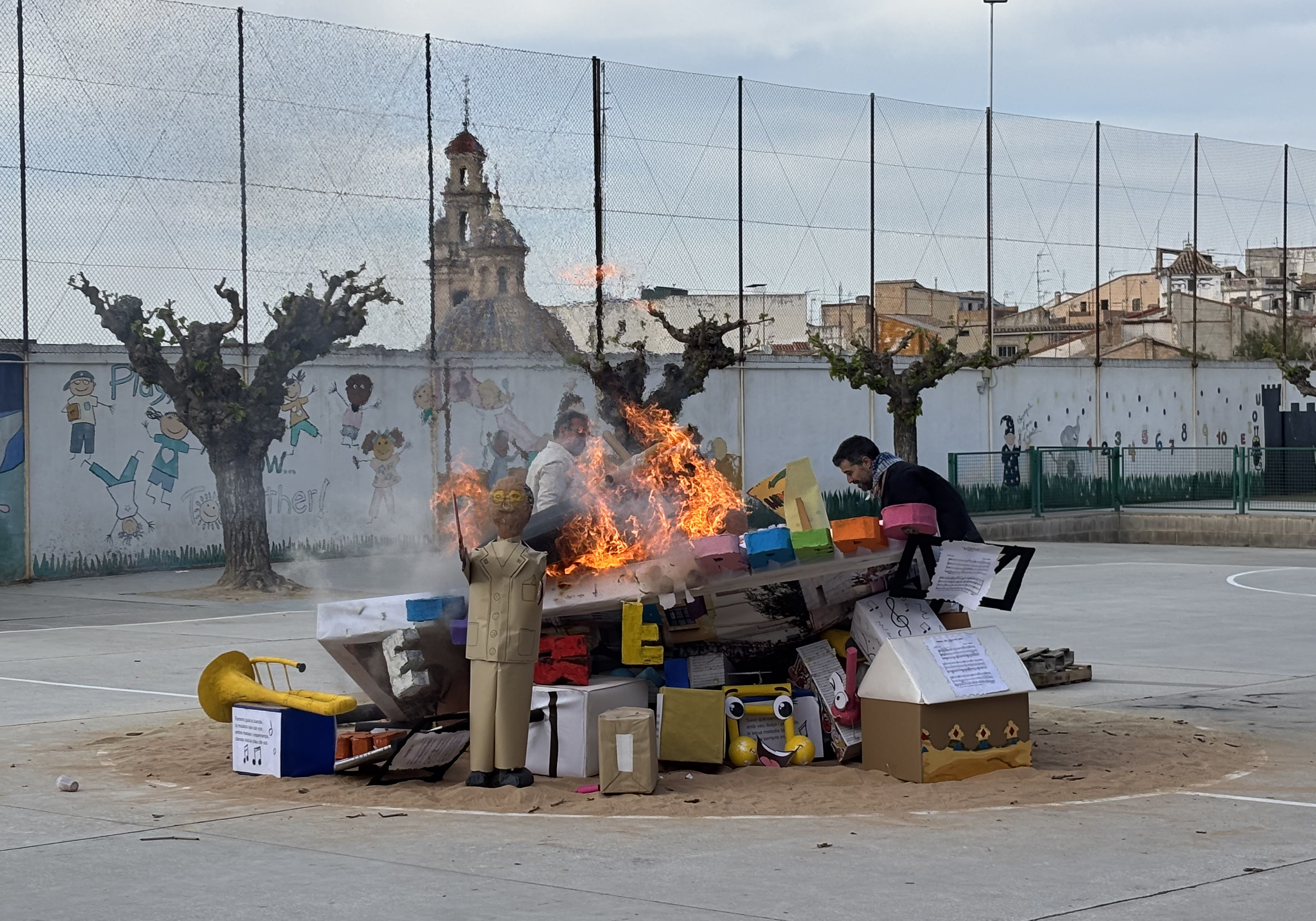 A las 16:00 abrieron las puertas del colegio, para a continuación, celebrar una “botellá” musical y la ofrenda. Tras reponer fuerzas con chocolate y buñuelos, tuvo lugar el punto culminante de la tarde: la elección del ninot indultat y de la cremà de la falla.