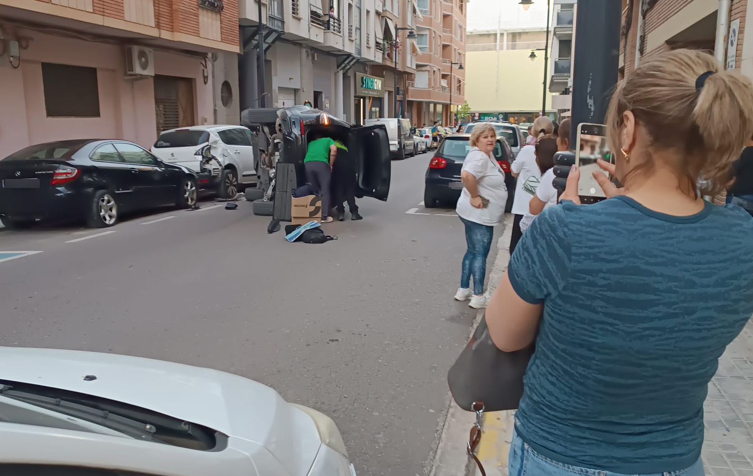 La calle Ereta de Ontinyent ha sido escenario de un accidente que ha terminado con un coche volcado y ha chocado contra dos coches que estaban estacionados en la calle Ereta. El vehículo bajaba por la calle José Simó Marín y ha tomado la curva hacia la calle Ereta, momento en el que ha perdido el control del coche y ha chocado contra dos coches que estaban estacionados.