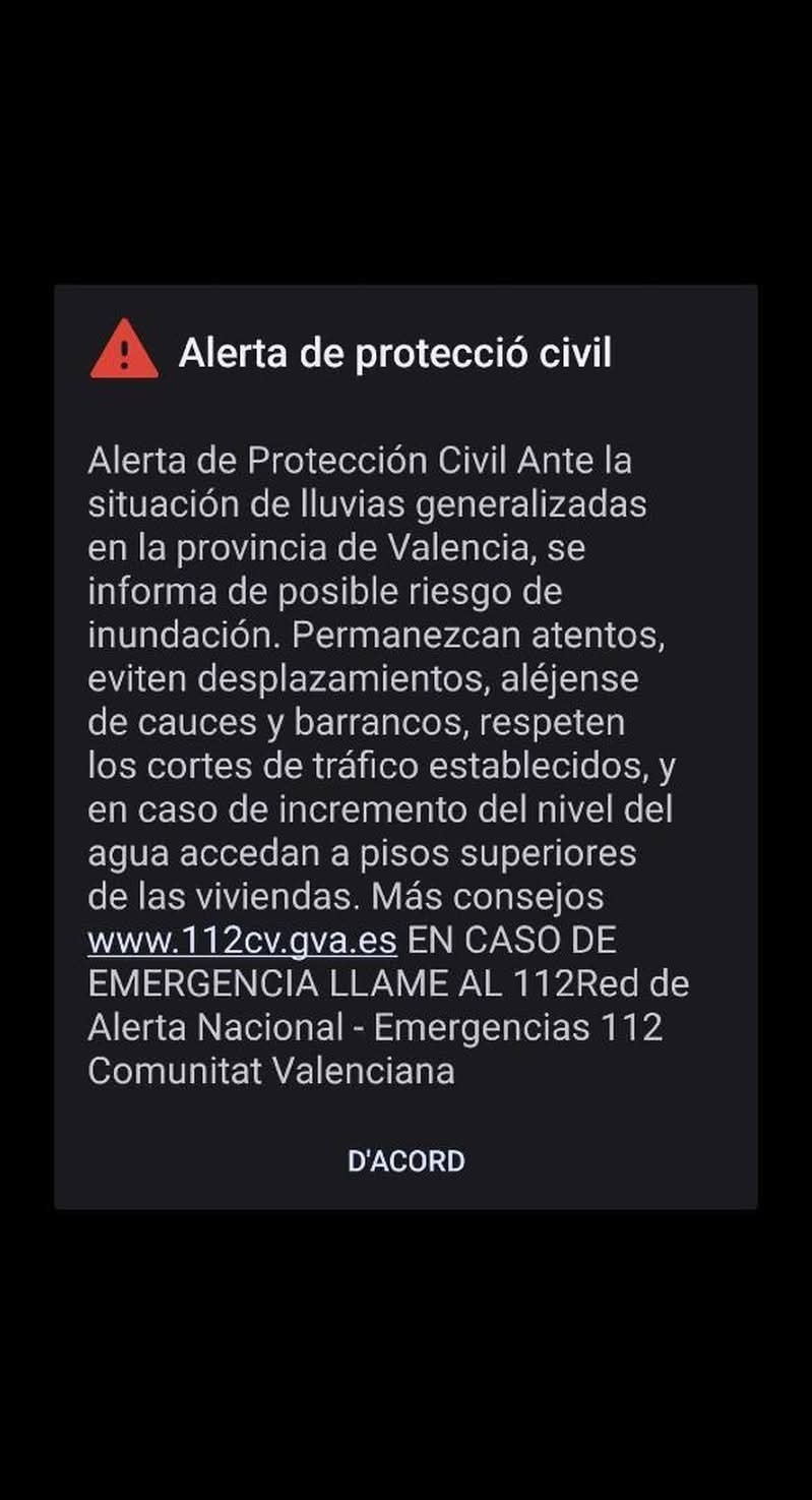 Protección Civil ha enviado esta tarde una alerta a través del sistema Es-Alert a toda la provincia de Valencia ante la posibilidad de fuertes lluvias y riesgo de inundaciones. Se aconseja prestar atención, evitar desplazamientos y alejarse de cauces y barrancos. Además, el mensaje pide que se respeten los cortes de tráfico establecidos.