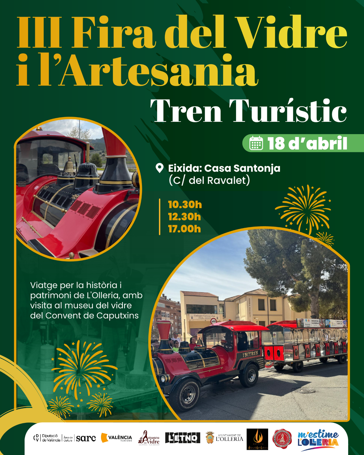 El públic visitant també tindrà a la seua disposició un tren turístic que recorrerà els llocs patrimonials més importants del poble, amb la narració del cronista de L’Olleria, Jovi Vidal, i visitarà el museu de vidre del Convent dels Caputxins. Mentre que les mes menudes i menuts comptaran amb jocs de fusta, tallers infantils i pintacares, per a assegurar una jornada d’allò més divertida.