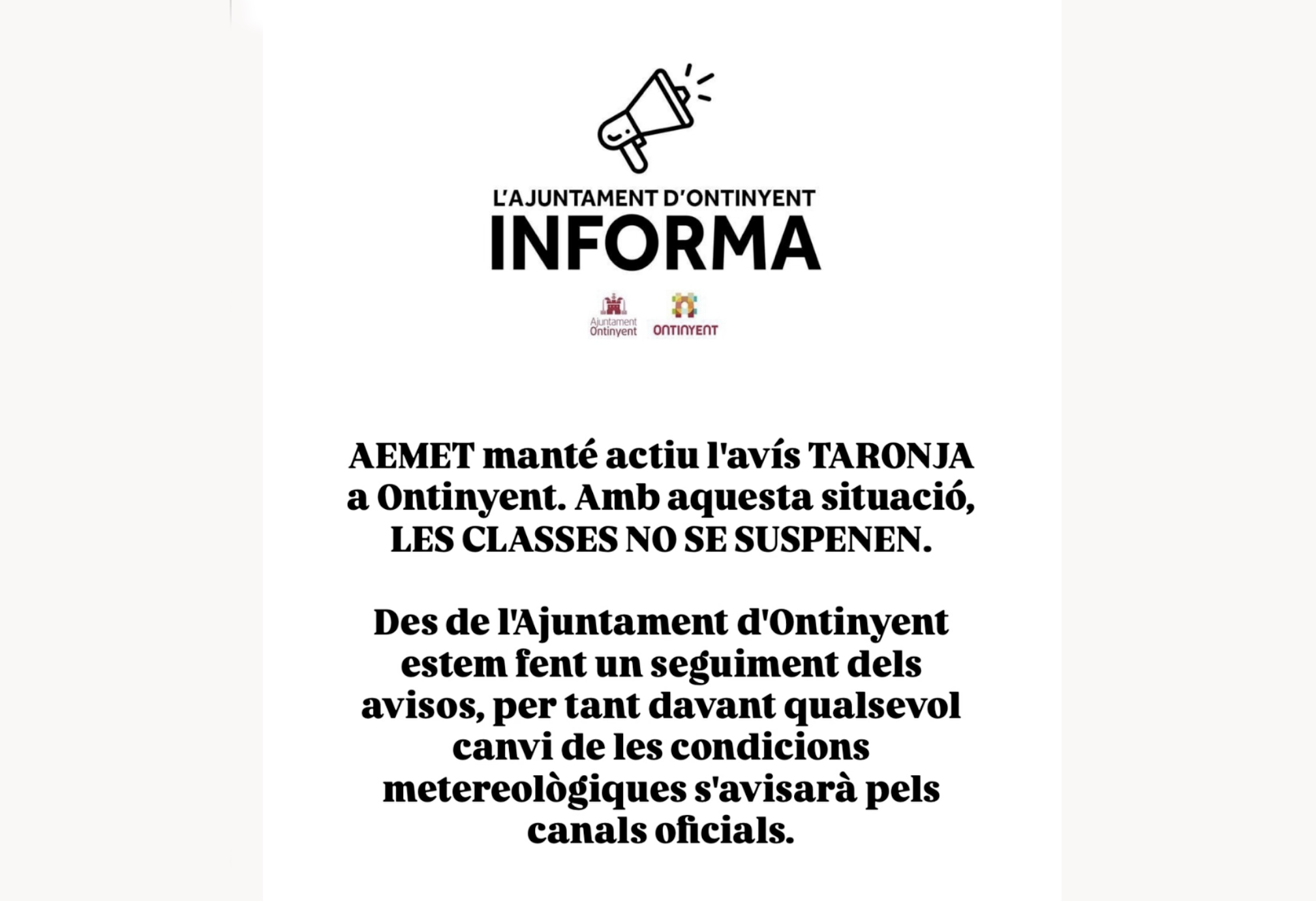 Ontinyent ha començat hui dilluns l'activitat escolar amb total normalitat, segons explica Ferran Gandia, regidor d'Educació. Tal com va anunciar el diumenge l'Ajuntament, l'activitat lectiva no se suspenia, ja que Ontinyent està en alerta taronja. Això sí, se seguirà l'evolució del temporal per a prendre mesures en el cas que foren necessàries, mesures que s'anunciarien pels canals oficials.