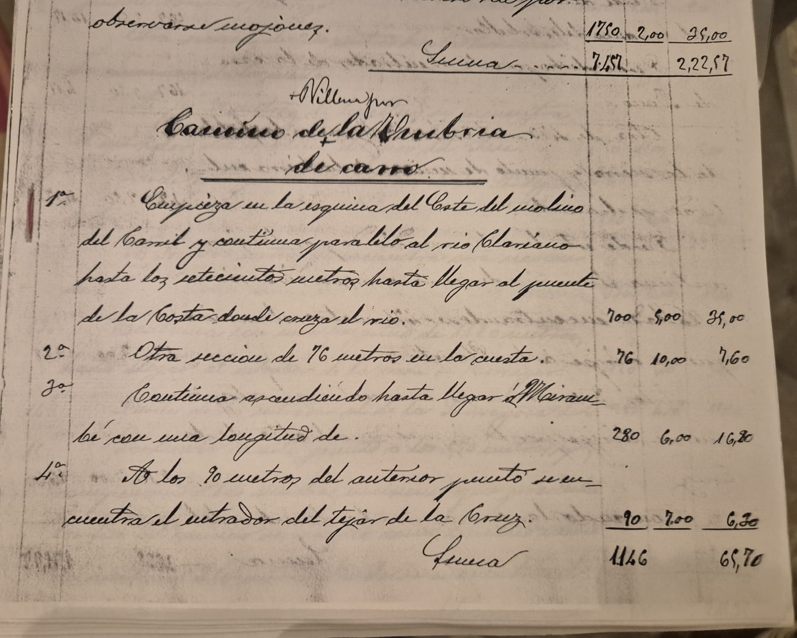 En un document finals del segle XIX, “Itinerari dels camins veïnals existents en el terme municipal d'Ontinyent” es detallen les seues denominacions, característiques i distàncies. Val la pena reproduir alguns paràgrafs que aporten cuiriosa informació: “1a) Comença a la cantonada de l'Est del molí del Carril i contínua paral·lel al riu Clariano fins als set-cents metres fins a arribar al pont de la Costa on travessa el riu. 2a) Una altra secció de 76 metres en la costa. 3a) Contínua ascendint fins a arribar a Mirambé amb una longitud de… (en blanc). 4a) Als 90 metres de l'anterior punt es troba l'entrada del tejar de la Creu. 5a) Partint d'aquest punt als 160 metres es troba la Creu on es queda a l'esquerra el camí de la Escaralola (sic) i cova de la Sotamaña, 160 metres. 6a) Una altra secció de 244 metres fins a arribar a la caseta d'Esparza del teuler de Vicente Mollá….”